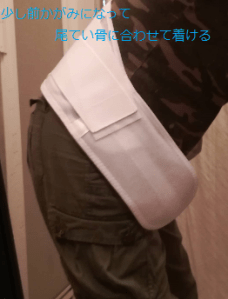 そんなコルセットの巻き方は、整形外科で習ったのと少し違います。整形外科のコルセットは少し大きいのでウエストの部分で腰を支えるイメージ。ただし整骨院で習ったやり方は整形外科で習った腰ではなく、尾てい骨を隠すようにして前の方の骨盤を支えてV字になるように止めるのが理想的