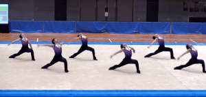 一般的な【バランス】は片足で立って、もう片方を水平に伸ばす行為になります。これを【水平バランス】と言い、2秒静止する決まりです。足を水平に保つのもキツイのに2秒を静止に加えて、足を上げるのも下ろすのも団体戦だと揃っているので、1人でもズレると目立ちます。