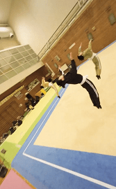 これって良く見掛けます。どこで見掛けるかというと…佐藤三兄弟のバク転する時です。写真だと側転と似ているように見えますが、ロンダートはひねりが入るので進む方向に対して最後は後頭部になります。側転は側転のまま終わるので、進行方向に対して最後は顔の側面になっています。