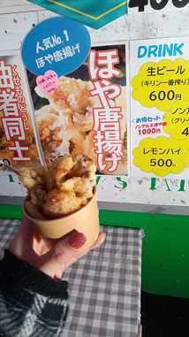 今回もキッチンカーが出ると聞いて前回のリベンジをしたかったsakurabell。前回は数量限定になってた【ほやほや屋】のホヤのから揚げ。1日目のイベント終了時もオープンしてたので「ありますか?」って聞いたら、今回は大量に準備してあると言われたので飛びついたよね。